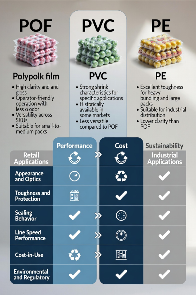 A useful way to frame it internally is: POF typically aligns better with modern packaging material strategies, particularly those focused on polyolefin-based systems and reduced material usage.